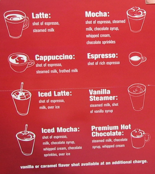 A close-up of the sign that descibes for the customer what McDonalds says goes into the various coffee drinks. I found this more helpful than the signs at any other coffee shop I've been to before.
