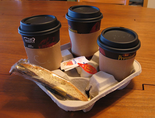 I decided to get a cappuccino, a mocha, and a cup of regular coffee. I also decided to try the biscotti. I watched the barista make the coffee and she bascially did the same things they do at every coffee place. It took a bit for her to walk to the back of the store to get the can of spray whipped cream for the mocha.
