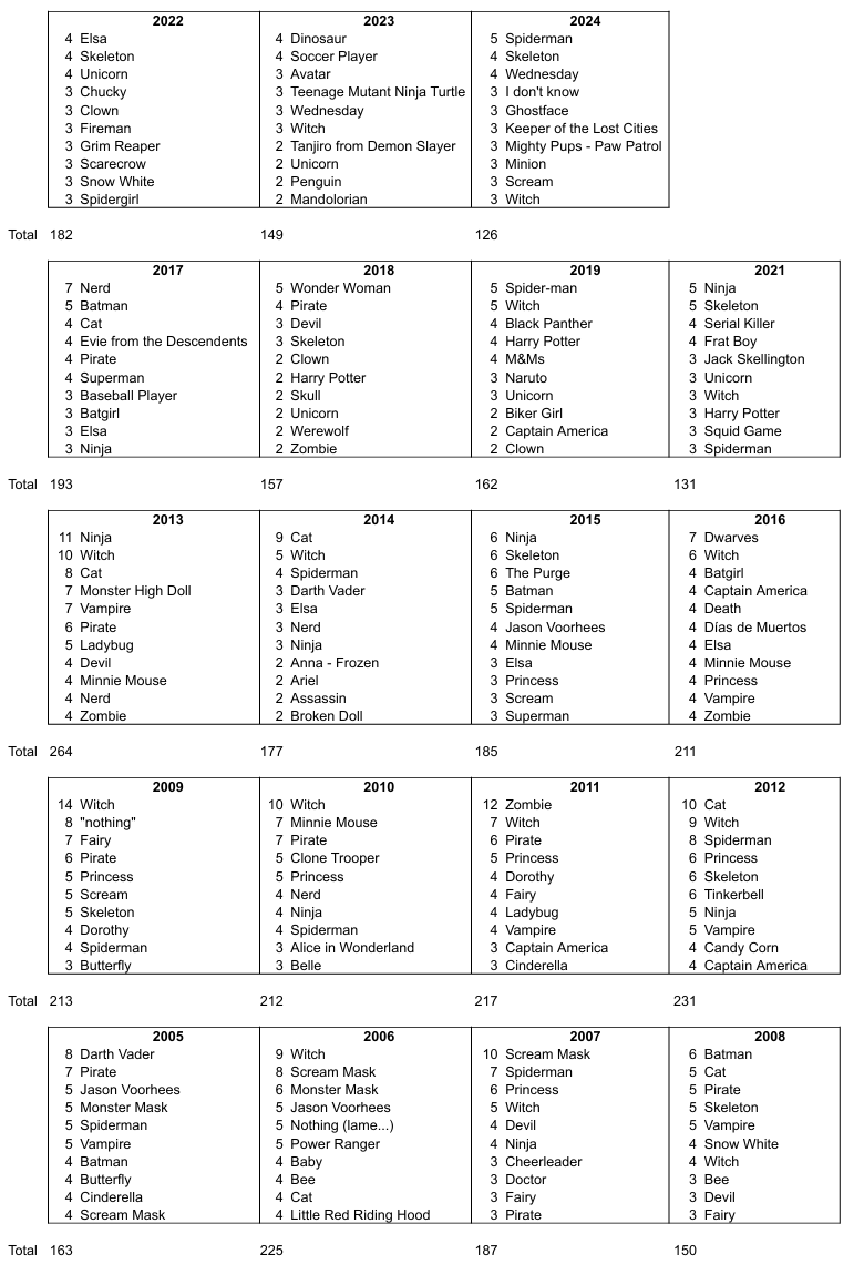 This Halloween makes it 19 years of data to compare, though 2005, 2006, 2007, 2008, 2009, 2010, 2011, 2012, 2013, 2014, 2015, 2016, 2017, 2018, 2019, 2021, 2022 & 2023. We did not give out candy in 2020 due to the pandemic.